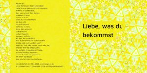 Räume aufLasse den Dingen ihren Lebenslauf.Liebe, was du bekommst und vermehreim März zu Gottes Ehre,das, was du hast: Den Samen.Im tiefen A(t)men.Komm‘ in dir an,seiest du Frau oder Mann. Sei …